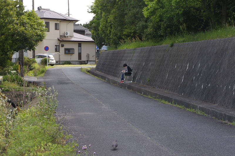 東名高速道路沿いを歩いていると屋外で勉強をしている男の子を