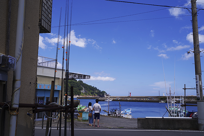 釣具屋の貸釣竿の向こう側には、港を見る若い男女がいた
