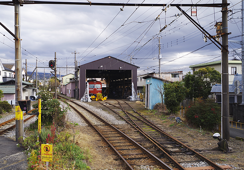 そしてある駅では、小さな車庫で整備中の電車が停まっていた