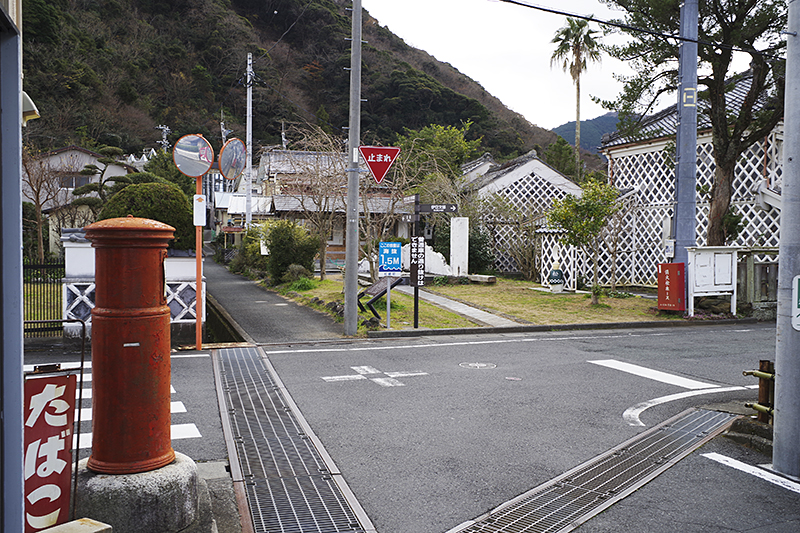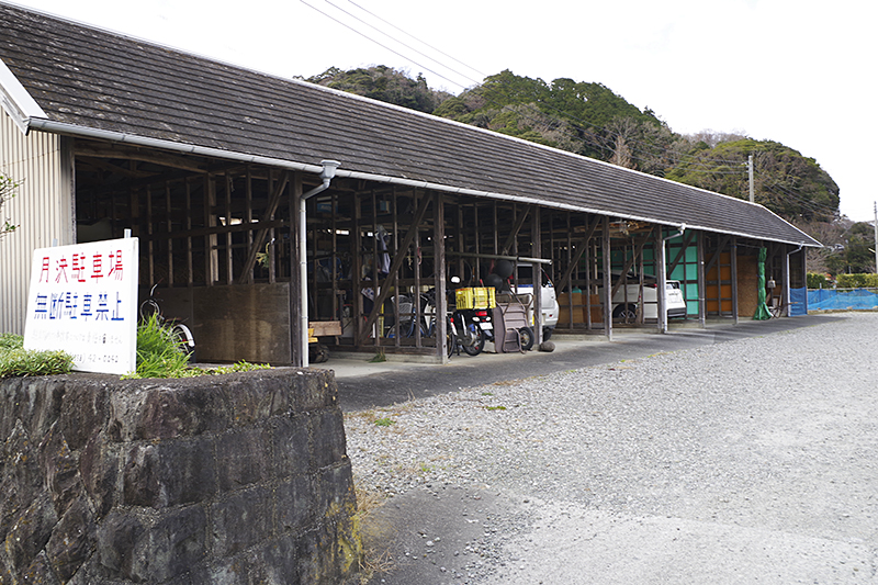 松崎6 2019年2月6日 石原美千夫 松崎6 港から町のほうに歩くとやはりナマコ壁の風景が増えてきた 古いポストとタバコの看板にこの壁が重なると タイムスリップしてしまったかのような風景になる そして木造の駐車場もあまり見ない構造物になった