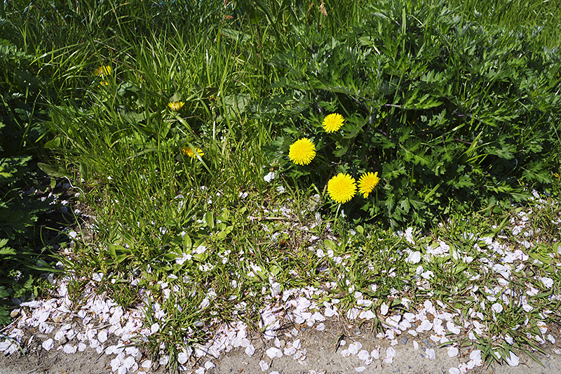 袋井~菊川 1 2019年4月19日 石原美千夫 袋井~菊川 1 4月の中旬の良く晴れた日 袋井から菊川にかけて山沿いの道を歩いた このあたり桜は見頃を過ぎ、散り始めていた 緑地にはタンポポの花が咲いていて その周囲は散った桜の花びらがたくさん落ちていた 正に今の季節ならではの写真だ