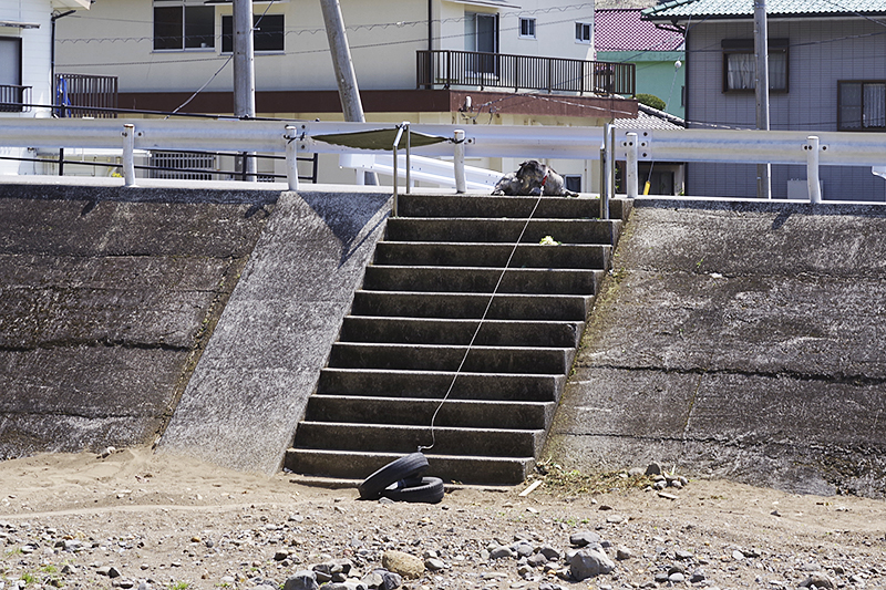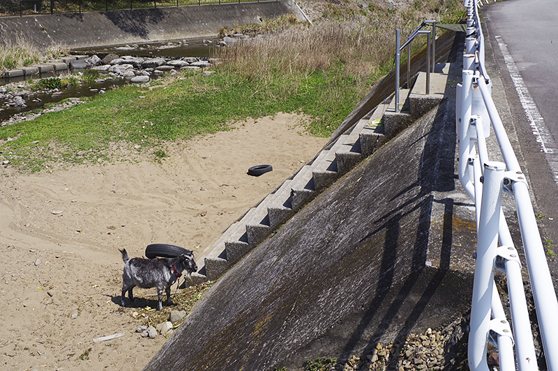 川の反対側に何かが横たわり、草のようなものを食べていた