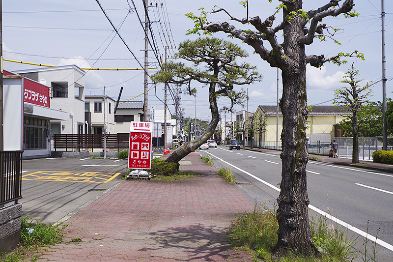 歩道を塞いでしまうかのように松の木の幹が曲がっている