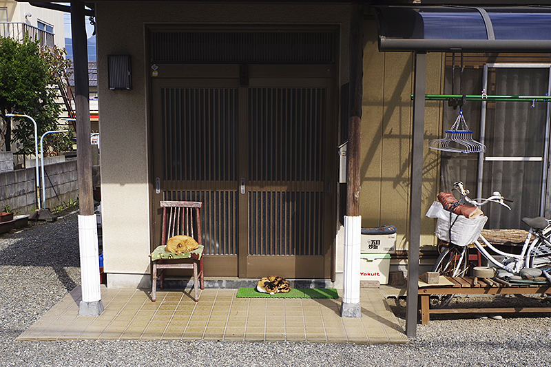ある住宅の玄関先には2匹のネコが気持ちよさそうに寝ていた