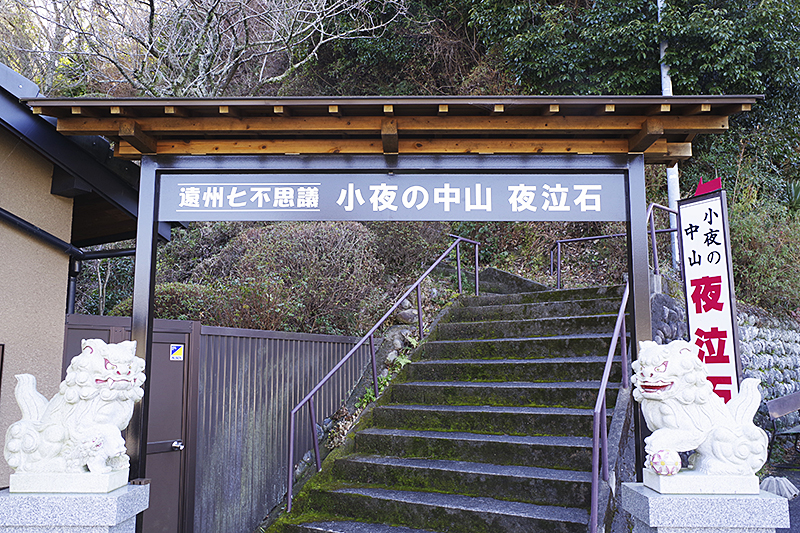 「遠州七不思議 小夜の中山 夜泣石」と書かれた立派な門を見つけた