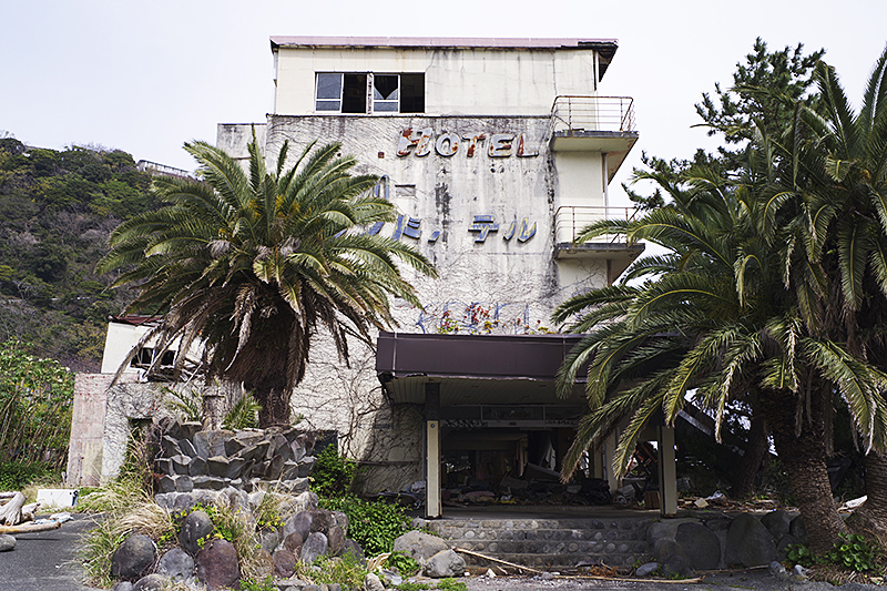 海まで下ってみると海岸沿いには廃業したホテルがあった