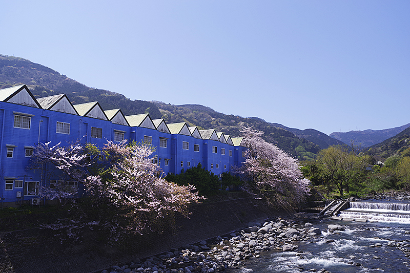 そしてその建物の手前には、川沿いの満開となった桜の木が何本か見えた