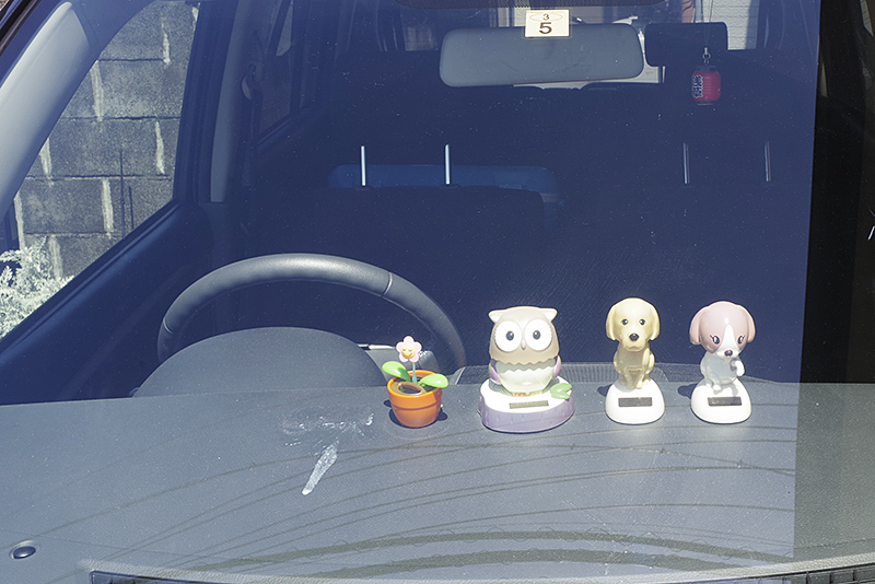 しばらくすると、停車中の車のフロント部にソーラー人形が