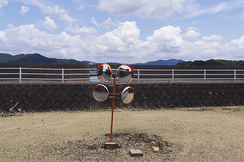 民家の並ぶ通りと自転車道の間にある空き地にミラーが置かれていた