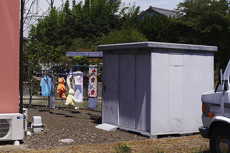 このお宅では、大きなぬいぐるみが二つ物干しに吊るされていた