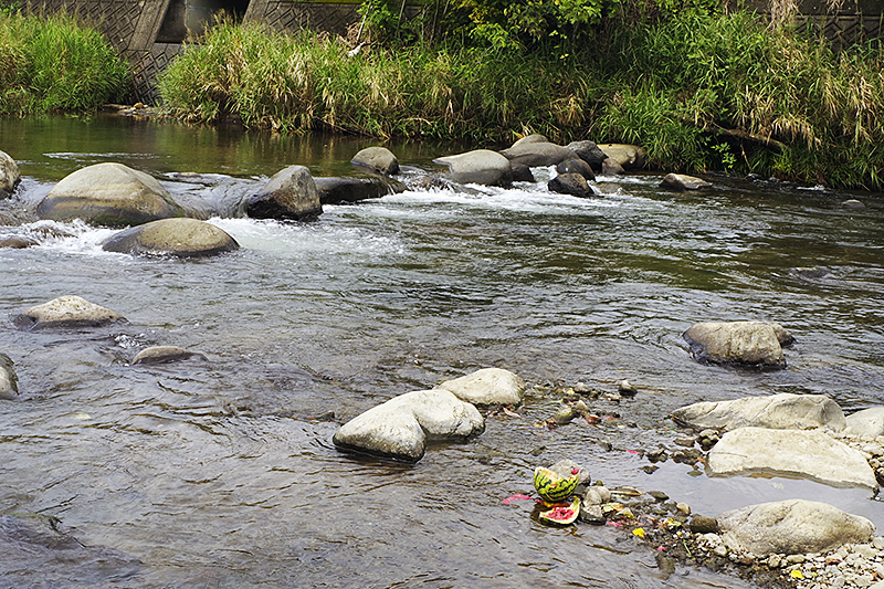 橋を渡ろうとした時に、川の中にスイカの残骸が