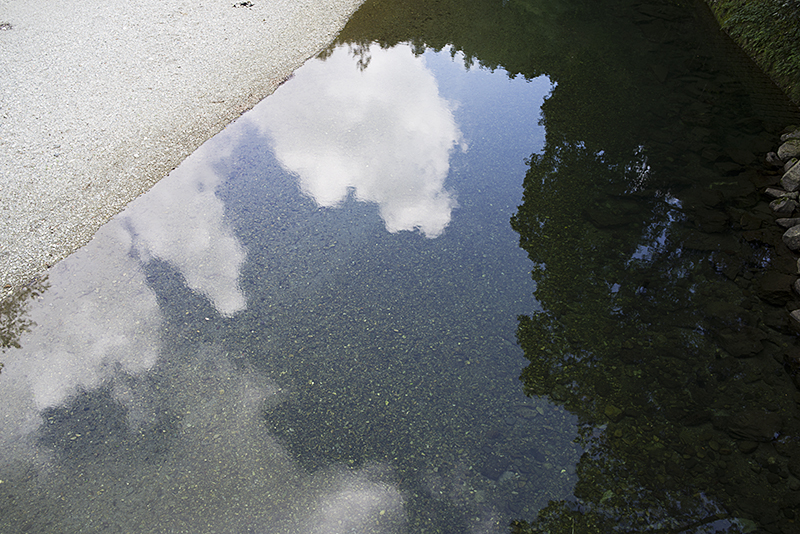 水面が見える場所があったので、眺めてみると木々も雲も水面に映るほど透明だった