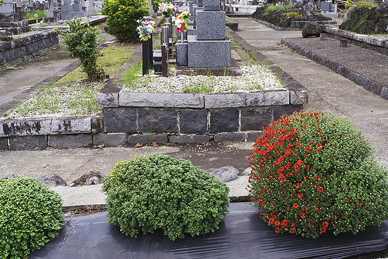 お墓の道沿いに植えられた菊がきれいに揃って南側から