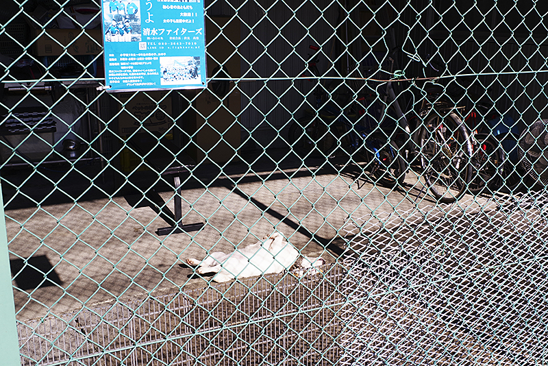 金網で道路と区切られた庭先で、まるで死んでいるかのように