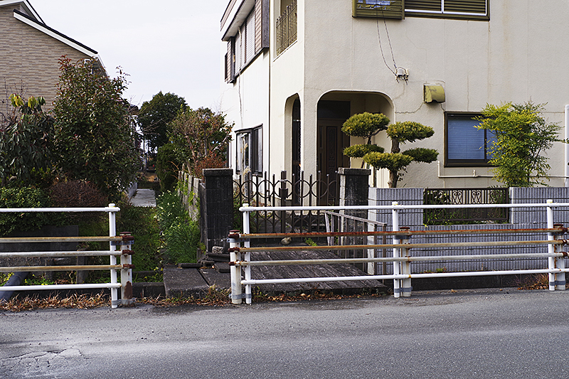 住宅と少しズレたガードレールの隙間からになっている