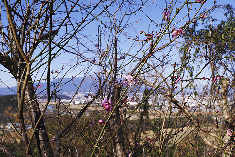 途中、山の中腹あたりで梅が咲き始めているのを見つけた