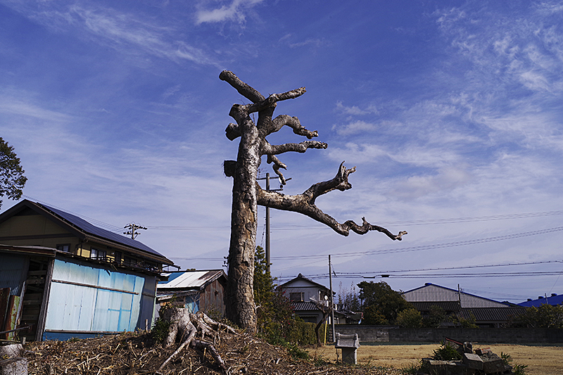 袋井から磐田10 2021年3月15日 石原美千夫 袋井から磐田10 民家の空き地には枯れてしまった大きな木がそびえたっていた まわりは空地や低層住宅なのでこの木が結構目立っていた 独特の幹の形なので、目印にされることもありそうな木だった 私には現代アートのモニュメントのようにも見えた