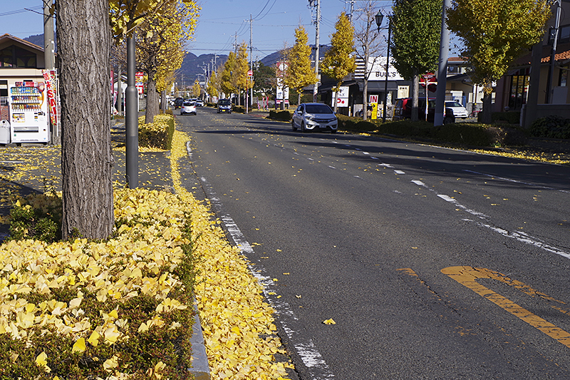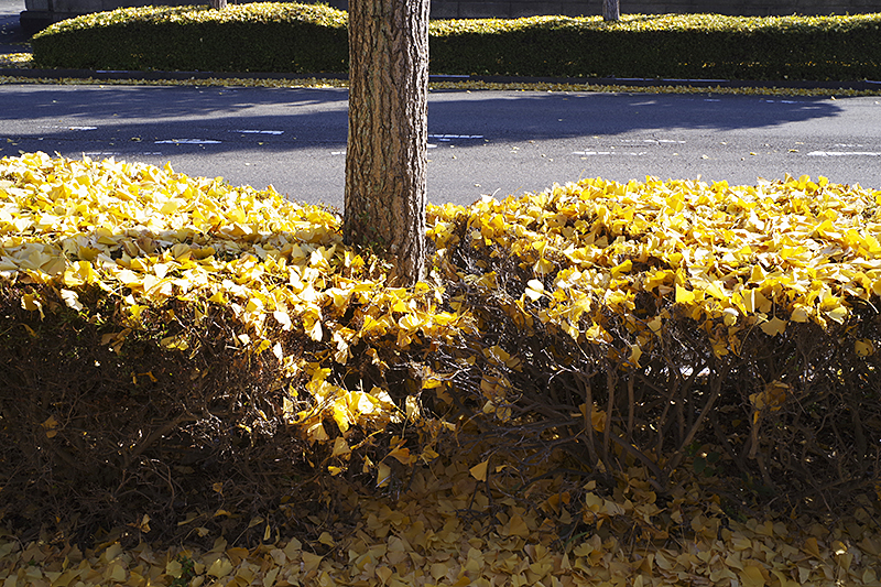 歩道やお店の駐車場などが眩いほどの黄色になっている風景は