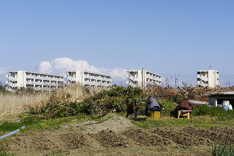 二人が畑に仲良く座る姿と、その向こうにある白いアパートが