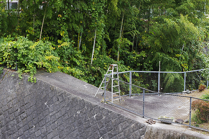 フェンスをまたいで脚立が立てられていた