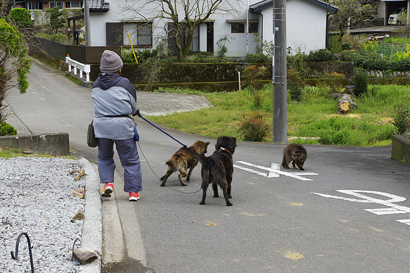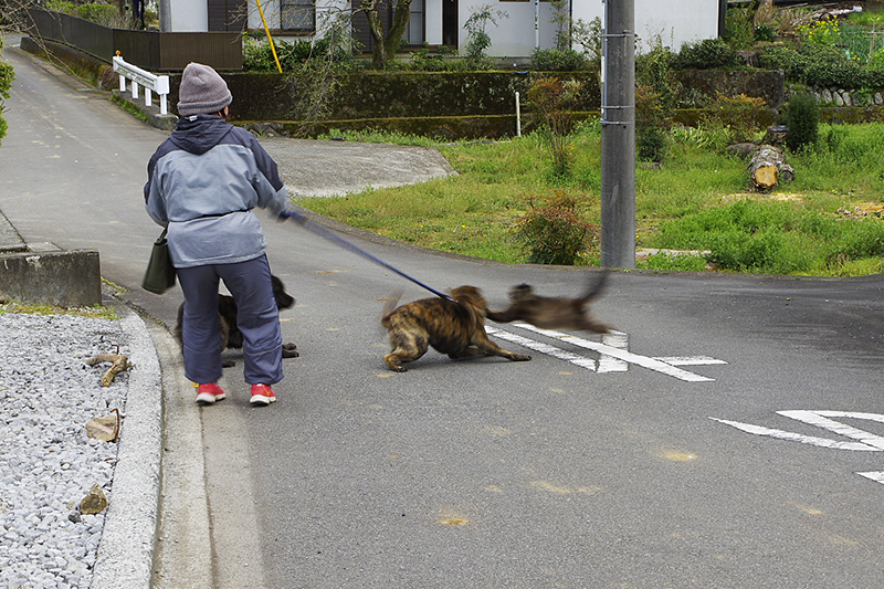 犬の紐を持つおばさんも犬がすごむ度に紐を引っ張られて