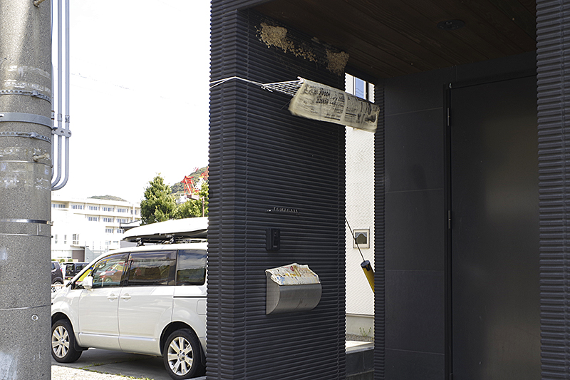 お食事処の窓につけられた飲料水の箱でできた段ボール製のポスト